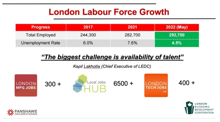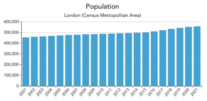 伦敦位于401和402高速公路的交叉口,成为连接多伦多、温莎和萨尼亚的枢纽。从401号高速公路出发,东北方向的多伦多需要2小时(192公里),西南方向的美国汽车之都底特律需要2小时(206公里),而从401号高速公路出发,向西到达加拿大和美国的边境城市萨尼亚需要45分钟。伦敦5年(2016-2021年)的人口增长率高达10%,远远超过安大略省的平均水平。该市吸引了大量世界500强企业和创新型企业落户,城市整体劳动力需求持续增加,为学生毕业后就业提供了良好的生态环境。