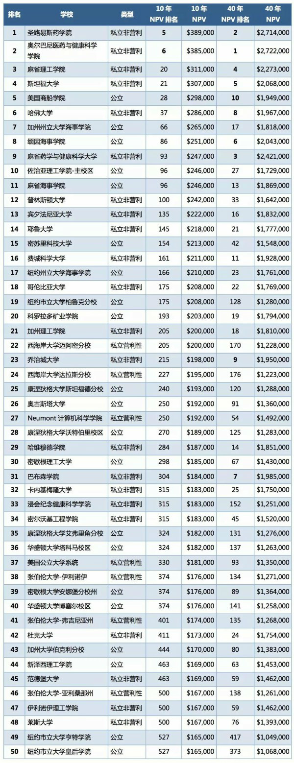 长期来看,在还完高额的学生贷款后,私立学校的平均40年NPV为838,000美元,要比公立学校的765,000美元高得多。准备前往美国留学的同学中,大部分都打算申请4年制学士学位的项目,因此接下来我们重点看一下这类大学里,10年和40年NPV最高的前50所大学排名。