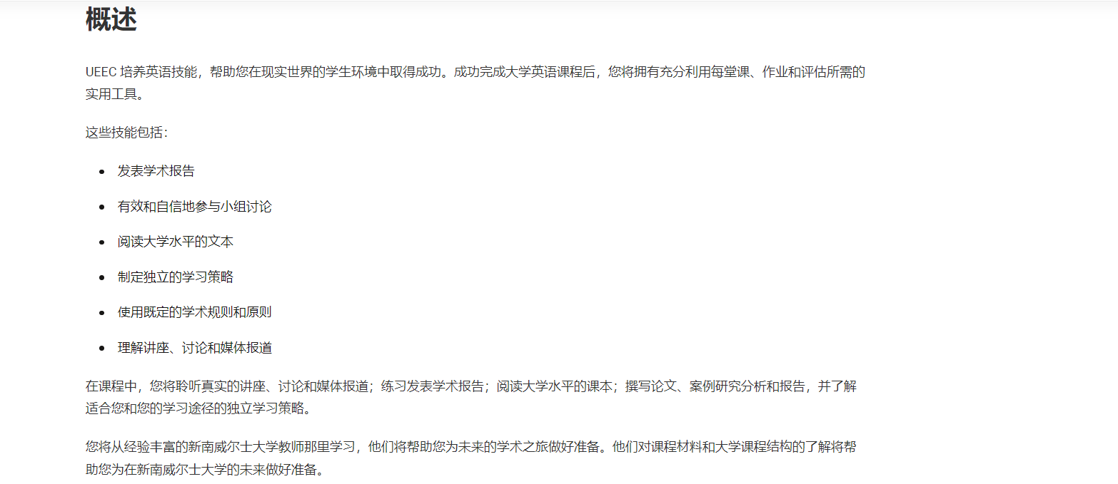 您是否收到了新南威尔士大学悉尼分校的有条件录取通知书,但不符合新南威尔士大学英语入学要求?我们的大学英语入门课程 (UEEC) 将帮助您在开始新南威尔士大学文凭课程或在悉尼新南威尔士大学攻读本科或研究生学位之前提高您的英语技能。在 20 周或更短时间内,这门高级课程将为您提供开始学习之旅所需的英语技能。如果您通过 UEEC,则无需参加任何其他英语考试。