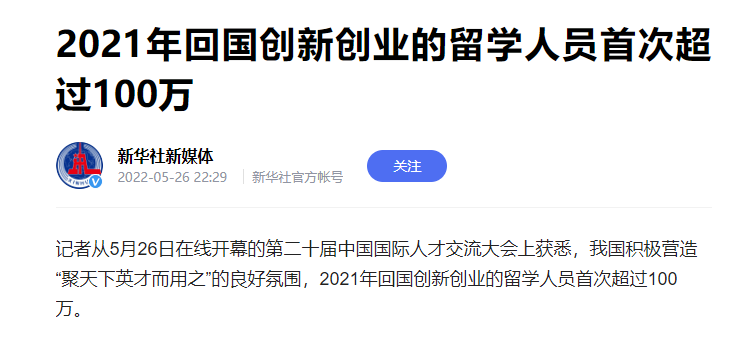 在 2020 年,数据显示有意在国内发展的海归人才数量较 2019 年猛增 33.9% ,增幅远高于 2019 年( 5.3% )、 2018 年( 4.3% )的同比增幅。 2021年回国创新创业留学生首次突破 100 万!