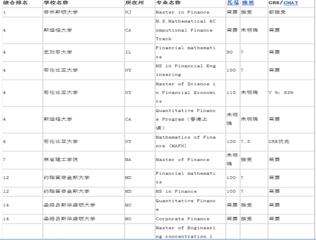 金融工程硕士要求申请者有很好的数学背景,如果不是数学专业的学生,就要求某几门数学课的成绩要比较好。总结美国所有金融数学专业情况,这些课程大致有:微积分(尤其是多元微积分)、概率统计、线性代数(包括特征值与特征向量)、微分方程(常微分方程、还有偏微分方程很重要)、概率统计、数值方法。如果在学校要求的课程中,有的课程申请者没有学过,那么可以在学习专业课程前先去补上这些课,再进行专业学习。 其它有关数学的要求是:gre的Quantitative较好,有的要求700分以上,还有的排名较高的学校则要求GRE数学部分在90%以上。 Purue University、University of Chicago、UC-Berkeley、Stanfor对数学的要求特别高,也特别偏向数学专业出生的学生,甚至要求申请者者递交GRE的Math SUB 成绩。 除此以外,如申请者有过在统计方面的工作实习经历,也会成为增强数学背景的一部分;如果曾经参加过数模竞赛等等比赛获过奖也是很有影响力的。