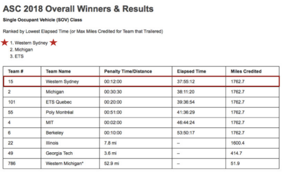 2018年世界太阳能汽车挑战赛美国赛区,西悉尼大学实力辗压美国众多牛队,包括MIT麻省理工,University of Michigan密歇根大学等。一夜之间,在美国爆红,成为历史上第一支澳大利亚队伍战胜美国队伍。精彩的赛果如下,