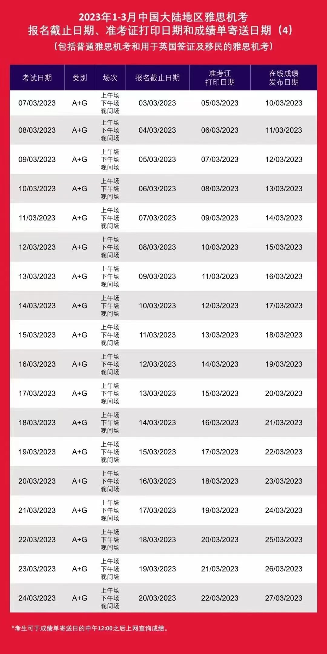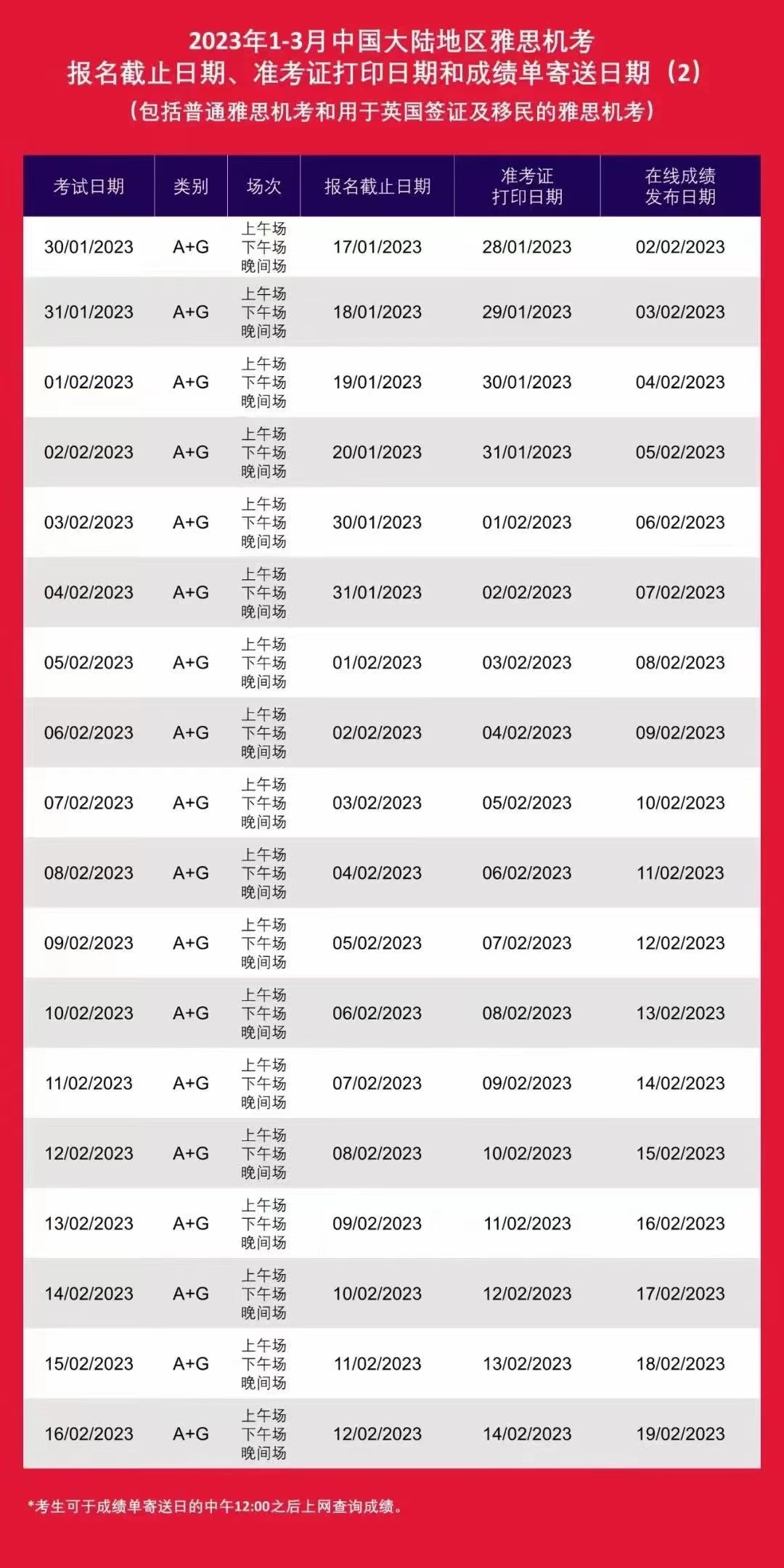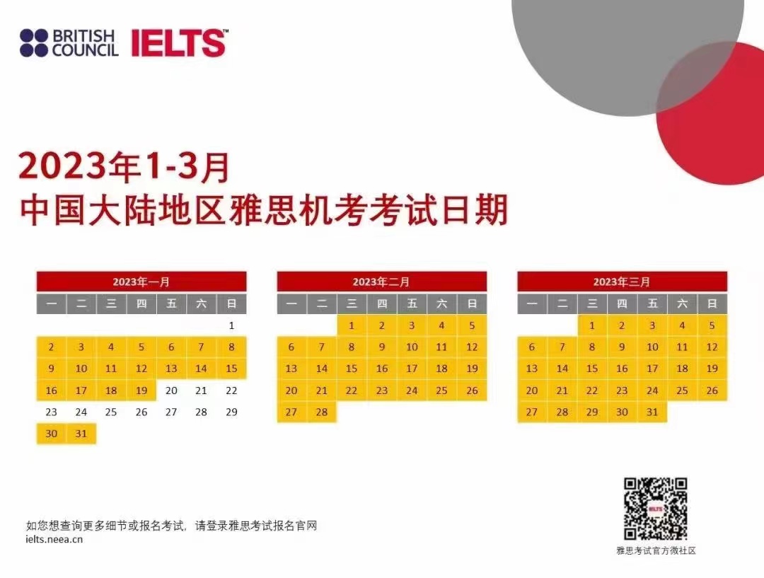 2023年1-3月中国大陆地区雅思机考考试日历: