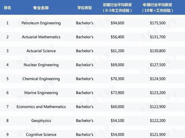 源自 PayScale2017-2018 College Salary Report