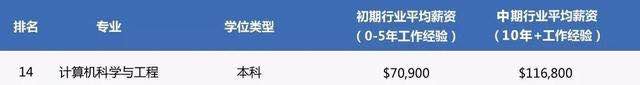 计算机科学的就业前景还是非常好的,毕业后可以从事高级程序员、系统分析师、网络管理员、数据库经理、软件开发人员、金融分析人员等多种职业。据 PayScale 2017-2018 学年大学薪资报告显示,在最具薪资潜力回报率的本科学位中,计算机科学专业排名第十四,起薪高,发展稳,本科毕业后 10 年以上工作经验,平均年薪即可达 60 万,十足的“钱途”行业。