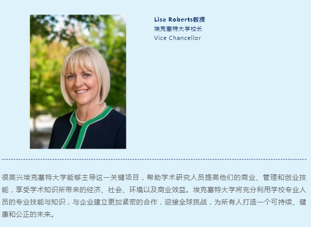 在英国特许商学院协会(Chartered ABS)的支持下,埃克塞特大学将带领英国境内多所大学推动这一项目的实施。届时, 埃克塞特大学项目团队将与英国各高校的商学院合作,为研究人员搭建起创新支持的平台, 强化学术人员的技能与心态,提高他们辨识商业机会并能更有效地与外部企业机构沟通的能力。