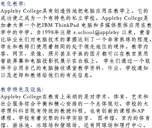 其他介绍性文字: Appleby College建校于1911 年, 是一个非盈利性的私立学校. 它位于多伦多西部40 公里左右的奥克维尔市, 是一所从七年级到十二年级的男女生学校。