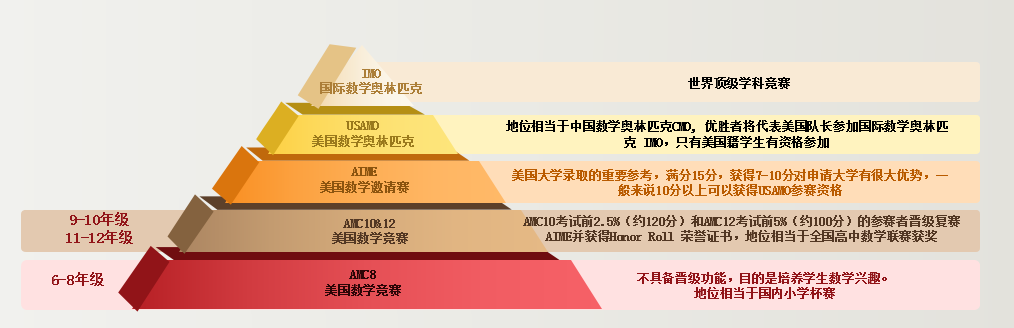 AMC是American Mathematics Competition是美国数学竞赛的缩写,由美国数学协会MAA举办,非常有体系的竞赛。目前每年全球超过6000所学校的30万名同学参与,是全球最有影响力的青少年数学思维挑战之一。分为AMC8/10/12,适合各个年级的学生参加。