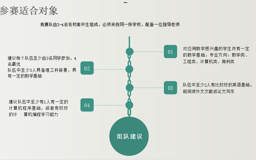 由美国数学及应用联合会COMAP主办的一项国际性的数学竞赛活动。是全球影响力最大的中学生数学竞赛之一,比赛采取论文评比方式,主办方会给出具体的题目,同学使用数学建模、编程等方式,建立数学模型,解决实际问题。