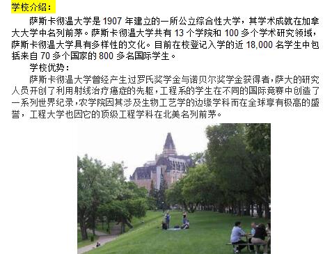 萨斯卡彻温大学是1907年建立的一所公立综合性大学,其学术成就在加拿大大学中名列前茅。萨斯卡彻温大学共有13个学院和100多个学术研究领域,萨斯卡彻温大学具有多样性的文化。目前在校登记入学的近18,000名学生中包括来自70多个国家的800多名国际学生。