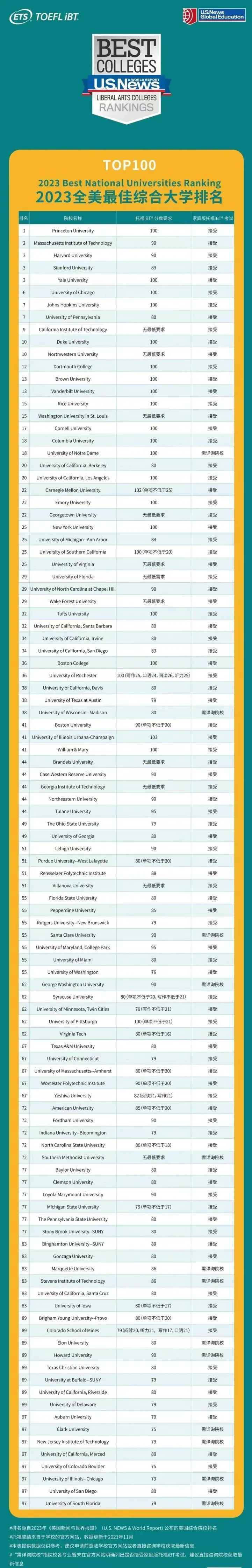 对于每个怀有留学梦的学子而言,一份优秀的语言成绩单可以帮助你在申请季脱颖而出,托福iBT考试目前拥有全球院校最为广泛的接受度,被160多个国家超过11500所大学和学院所认可,范围包括澳大利亚、加拿大、新西兰、美国、英国以及整个欧洲和亚洲。 总而言之,在逐梦的路上,托福一定是你的最佳选择!以美国为例,老师帮同学们找到了本次Top100美国大学排名托福成绩要求,快快保存转发: