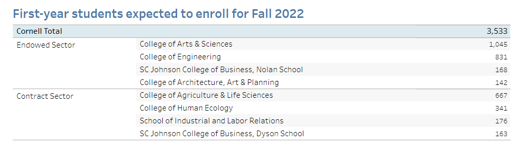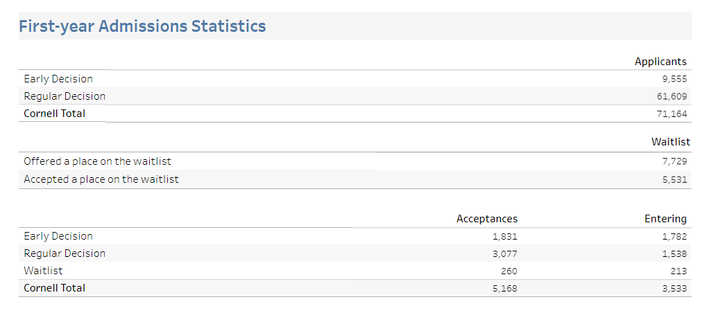最终有3533人入读康奈尔大学,其中RD录取入读为1538人(录取人数为3077人),RD录取入读率为49.98%;waitlist转正录取入读人数为213(转正人数为260),waitlist确认入读率为81.9%;