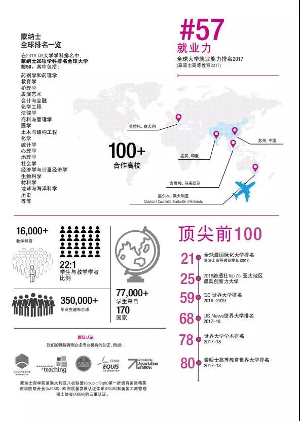 在最新发布的 2019QS世界大学综合排名中,蒙纳士大学位列 世界第 59名。 这所久负盛名的世界名校,一直保持着卓越的教学质量与科研成果, 多次被评为毕业生最受雇主青睐的澳大利亚大学之一。