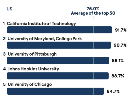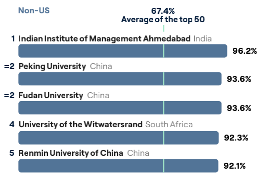值得注意的是,前五的大学中,有三所是中国大学:北京大学(93.6%)、复旦大学(93.6%)和中国人民大学(92.1%);另外两所大学分别来自同为发展中国家的印度和南非。