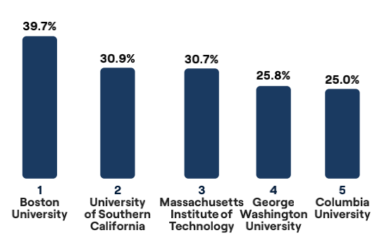 在超高净值校友国际化程度上,国际富豪校友占比最大的5所大学分别为波士顿大学、南加州大学、麻省理工、乔治华盛顿大学和哥伦比亚大学。