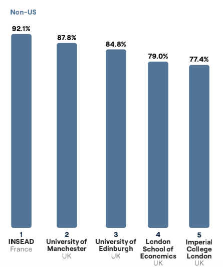 欧洲工商管理学院(92.1%)、曼切斯特大学(87.8%)、爱丁堡大学(84.8%)、伦敦政治经济学院(79%)、伦敦帝国理工(77.4%)位居前五!