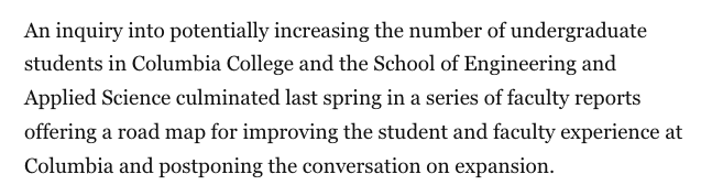 该报上周报道称,哥大一个专门委员会今年6月递交一份8页的报道,要求校方在2025年之前暂停评估本科生扩招事宜。其核心的理由是哥伦比亚大学目前教室、宿舍、课程等容量有限,扩招会导致学校无法提供应有的教育质量。
