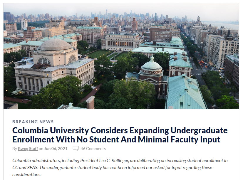 哥伦比亚大学校长 Lee Bollinger 在对教职工的讲话中表示,尽管他不会在“没有认真考虑其是否必要”的情况下赞同扩招,但他认为学校有义务培养尽可能多的优秀学生。
