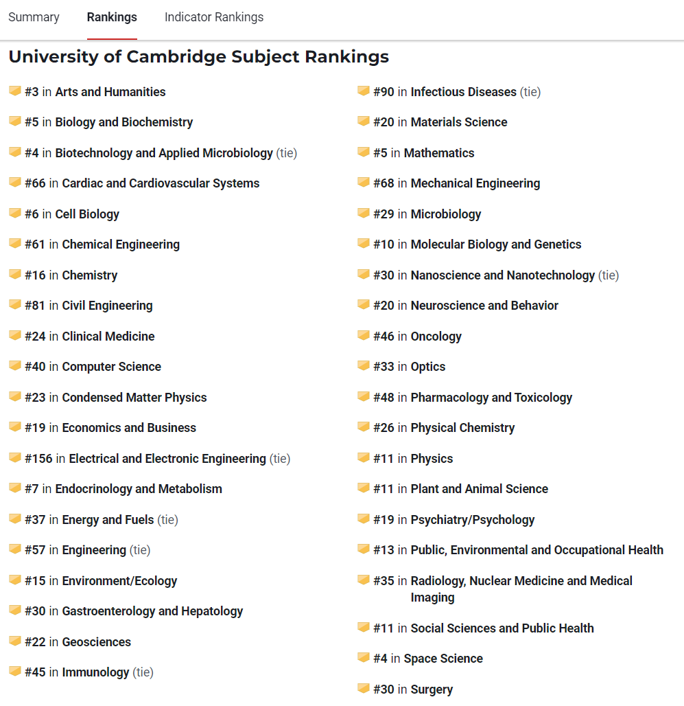 根据U.S. News数据显示,剑桥大学的人文、科学、工程、医药等专业,在全球都有不错的排名。艺术与人文专业排名第三。数学专业排名第五,且一直是剑桥大学的热门专业。生物类专业排名也在Top10。物理专业排名11,也是每年竞争非常激烈的专业。