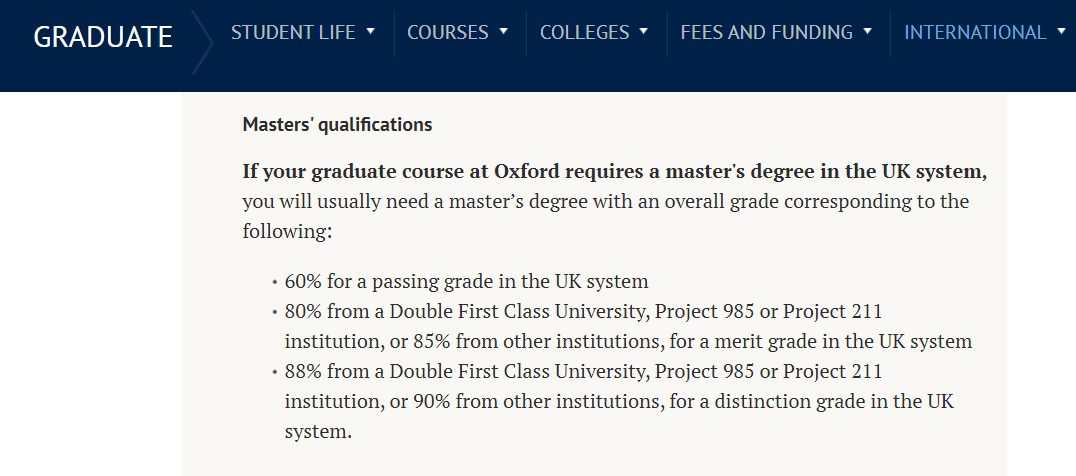 根据牛津大学的官网显示,国内985和211院校的学生申请最低本科学术均分为80%,对于其他院校的学生申请最低学术均分为85%。详细要求还是要参考各个专业的admission页面。