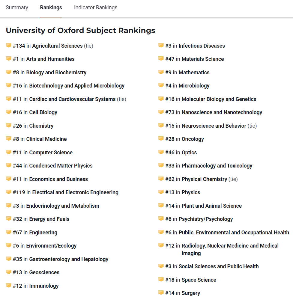 根据U.S. News全球专业排名数据显示,牛津大学艺术与人文专业排名第一。传染病专业、内分泌学和代谢专业和社会科学与公共卫生专业均排名第三。微生物学专业排名第四。环境/生态专业、精神病学/心理学专业和公共、环境和职业健康专业均排名第六。可见牛津大学在人文和医疗健康领域的强大实力。