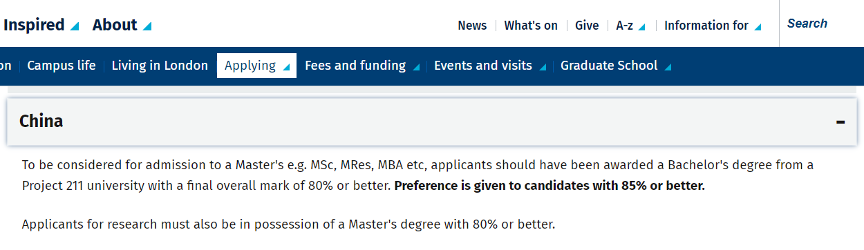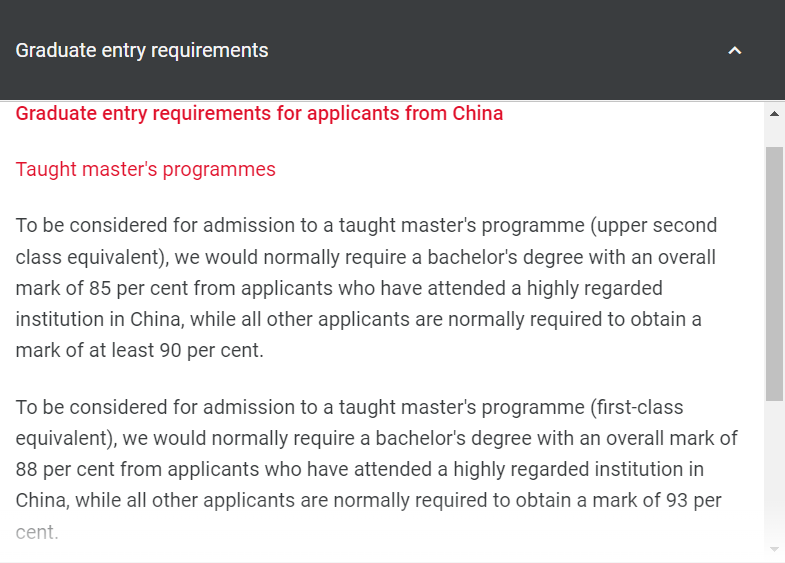 对于授课型硕士课程,二等一学位的专业对于国内985、211院校的申请者需要均分85%,而其他院校的申请人通常需要获得至少90%的分数。一等学位的专业对于985、211院校的申请者需要均分88%,而其他申请人通常需要获得至少93%的分数。
