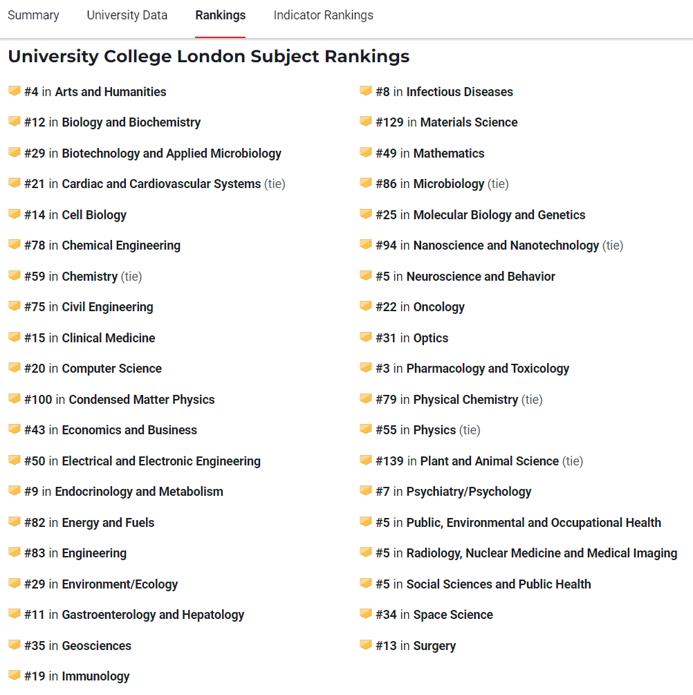 UCL的医学、解剖学和生理学、建筑学、教育学、考古学、计算机科学、计算金融学等学科排名均位居世界前列,与LSE并称为“英国现代经济学研究的双子星” ;其人文学院颁发的奥威尔奖则是政治写作界的最高荣誉。