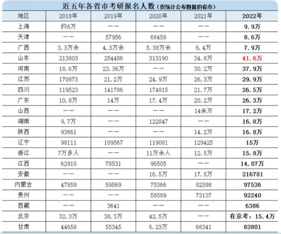 从已公布的省份来看,山东省增幅19.5%,略小于全国平均的21.2%,但仍然以41.6万的报考人数保住了考研第一大省的称号!而河南考生规模位居全国第二!同时我们可以看到江苏省、四川省、广东省、安徽省考研报名总人数也都超过了20万,有着明显的增幅。