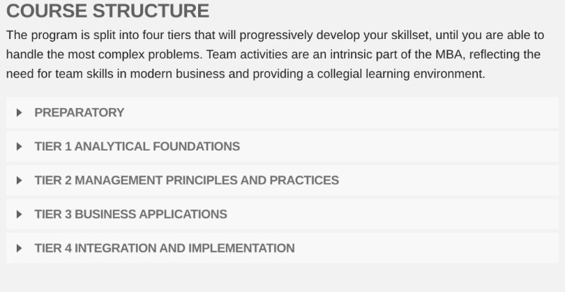 这个MBA项目分为四个层次,将逐步发展学生的技能。团队活动是MBA课程的内在组成部分,反映了现代商业对团队技能的需求,并提供一个合群的学习环境: