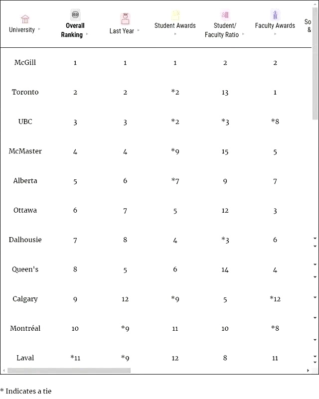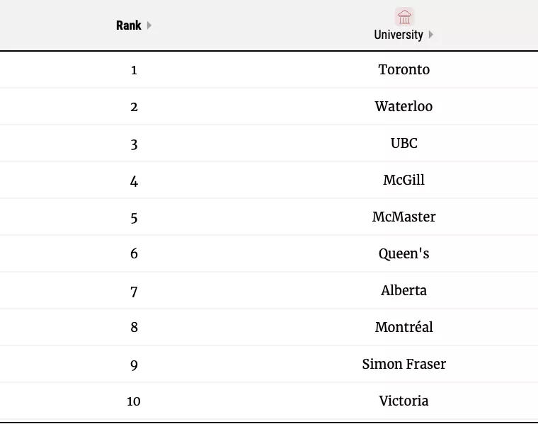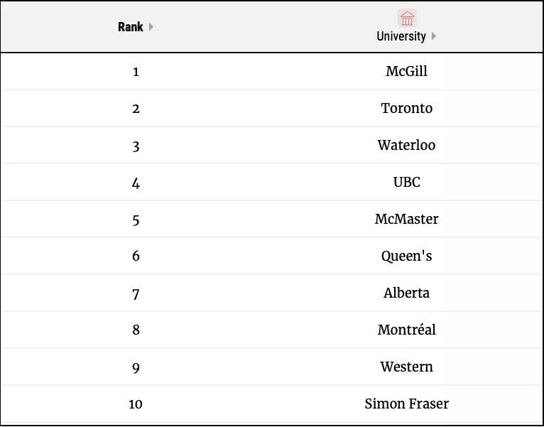 在教育、工程、商科、地质和医学方面有着雄厚背景的纽芬兰纪念大学也从去年的第八上升到了第七。