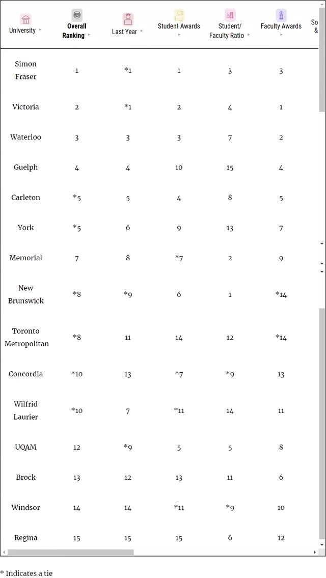 西蒙菲莎大学蝉联综合类大学第一宝座,除此之外,维多利亚大学、滑铁卢大学、圭尔夫大学、卡尔顿大学、约克大学的排名非常稳定,较去年没有变化,都是综合实力非常强的加拿大大学。