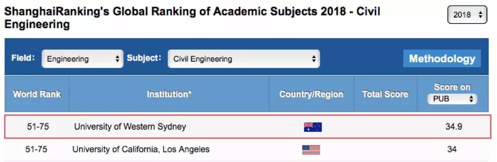 来自权威的世界大学学术排名 ARWU,2018最新公布的排名,西悉尼大学的土木工程名列全球51-75,与加州大学洛杉矶分校齐名。