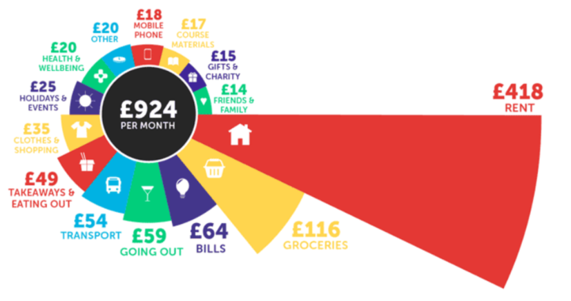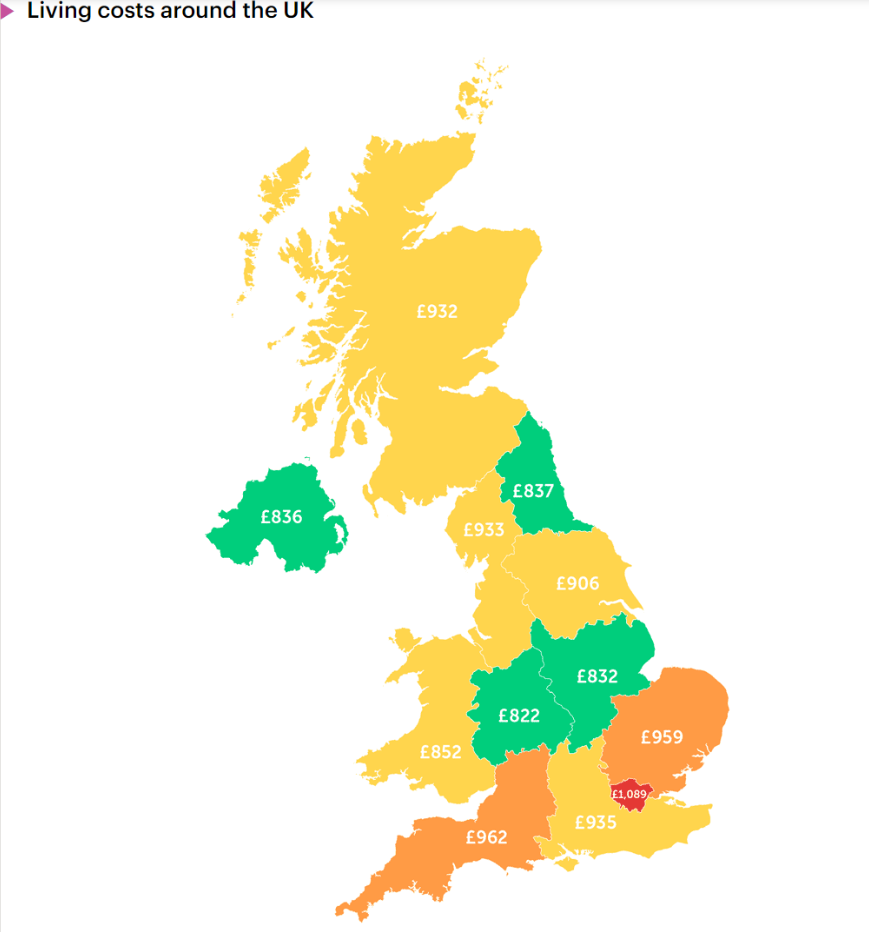 然而,今年所有地区的平均花费都在800英镑以上。学生花费最低的地区是西米德兰兹郡,平均每月生活费用为822英镑。英格兰西南部(每月 962 英镑)和伦敦(每月1089英镑)仍然是英国学生花费最高的地区。与去年相比,英国每个地区的学生在家庭账单和交通上的平均花费都有所增加。