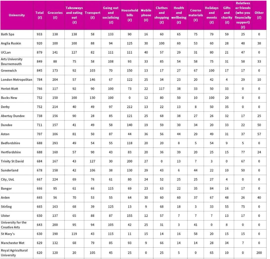 不包括租金,学生花费最多的Top10大学只有两所位于伦敦:格林威治大学和伦敦都市大学。