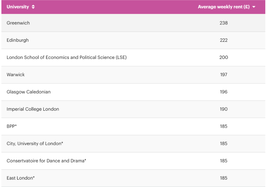 学生租金最贵的大学正如意料的那样位于伦敦,格林威治大学的平均每周租金高达238英镑, 成为住宿费用最高的大学,是全国平均水平的1.6倍以上。事实上,租金最贵的三所大学,另外两所是爱丁堡大学和伦敦政治经济学院,平均每周租金都在200英镑以上。