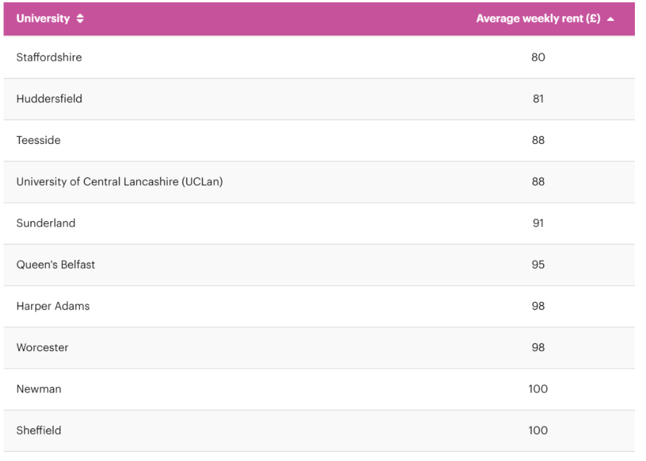 而学生租金便宜的大学几乎完全由位于英格兰中部和英格兰北部的大学主导。租金最便宜的大学是斯塔福德郡大学,学生报告的平均每周租金仅为80 英镑(略高于全国平均水平的一半)。有8所大学的学生报告的平均每周租金不到100英镑。
