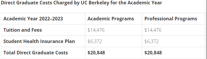 最常申的公立的加州大学系硕士项目,以加州大学伯克利分校(University of California, Berkeley,简称UCB)硕士项目为例, 一年的总费用包括学费(国际生需要另缴补充学费)、保险费和生活费 。