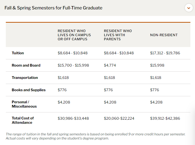 以德克萨斯大学奥斯汀分校(University of Texas at Austin简称UT Austin)的硕士项目为例, 国际生一年学费约为$20000,总费用约为$42000 。