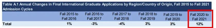 面对越来越火爆的美研申请,大家对其申请情况及录取数据都非常关注。早前,美国研究生理事会CGS发布了最新报告,对2020年秋季至2021年秋季国际研究生的申请、专业及录取等数据进行了详细的解读。