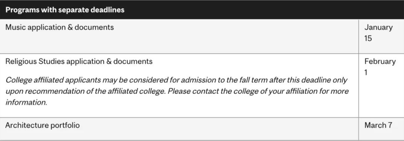 注意,音乐、宗教研究和建筑专业的申请时间线有所不同,可参考下图: