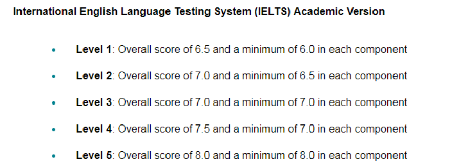 等级1:雅思总分不低于6.5,各单项不低于6.0分;
