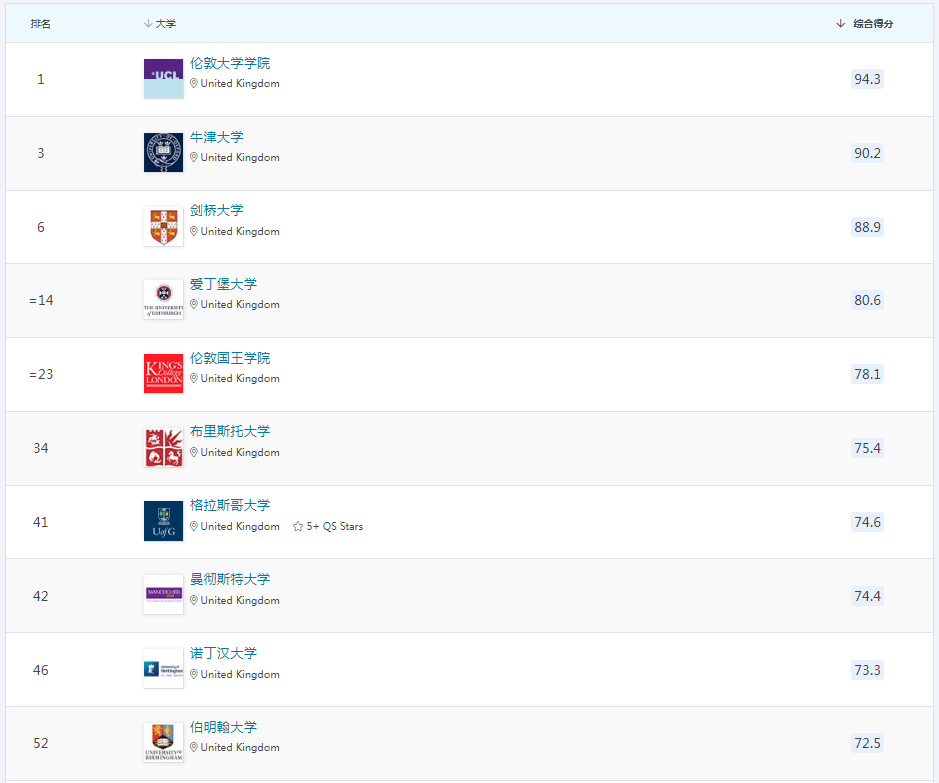 · 剑桥大学、斯特灵大学、杜伦大学、爱丁堡大学、曼彻斯特大学、爱丁堡大学、诺丁汉大学、格拉斯哥大学等。