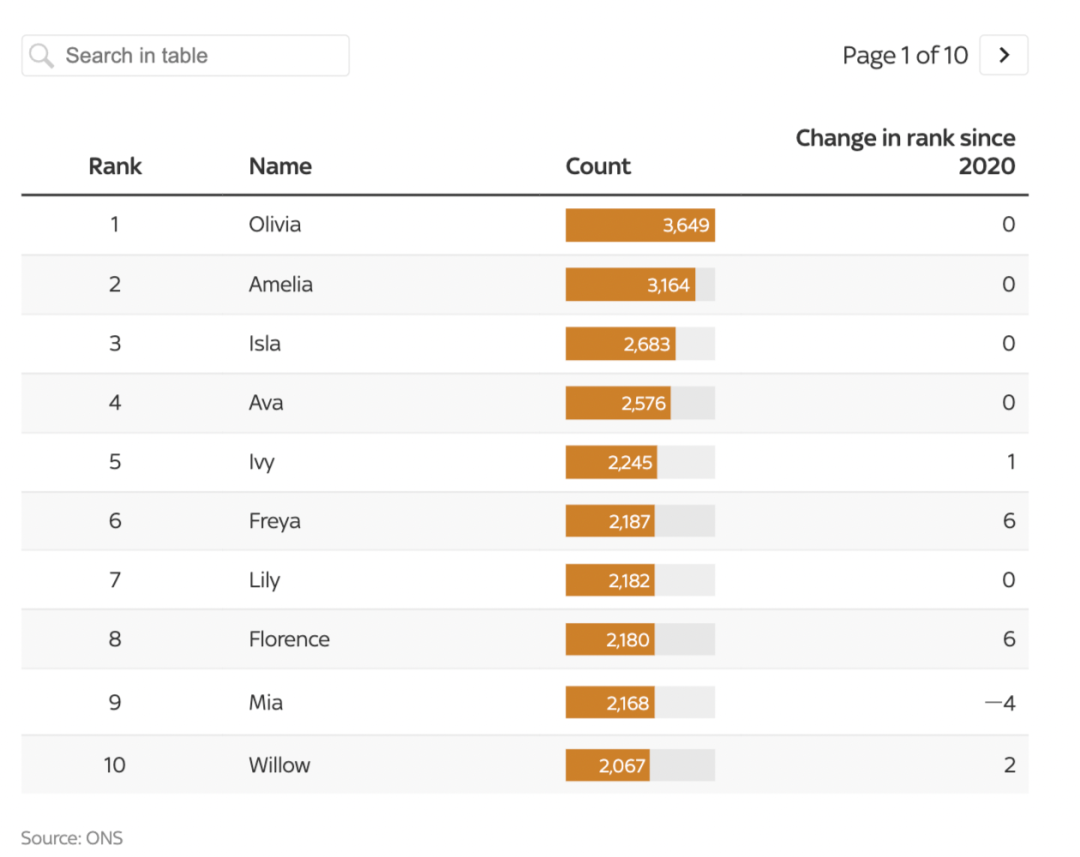在女生方面,Olivia连续第六年成为了最受欢迎的女生名字,而排名第二和第三的则是Amelia和Isla。Freya、Florence和Willow取代了Isabella, Rosie和Sophia,进入前10名榜单。