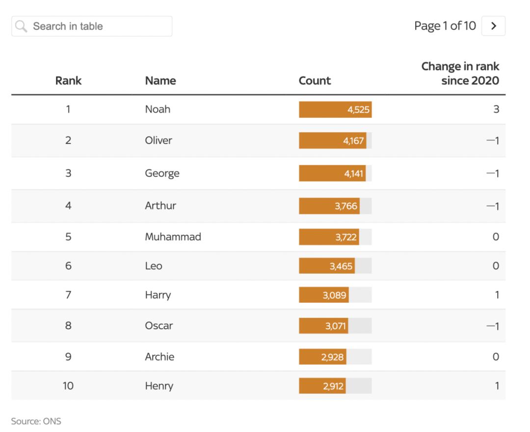 在男生方面,Noah结束了Oliver八年来作为英格兰和威尔士最受欢迎的男生名字的统治,成功登顶。Henry取代Jack进入了前十名,这也是自1996年来Jack第一次掉出前十名榜单。