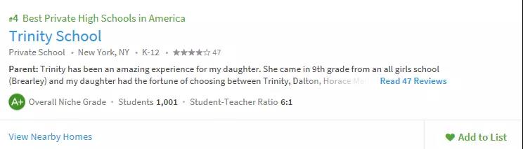 纽约三一学校位于纽约市,建于1709年,为美国的第五所最老的学校,包含从幼儿园到高中十二年级。 常青藤、斯坦福、MIT录取率高达47%。 Trinity School曾多次被《华尔街日报》评价为美国最好的三所学校之一。Trinity School有全美最强的拉丁语的训练,超过半数的学生学习拉丁语,每年有几十名学生参加全美作文竞赛获奖。 一直位居纽约时报最佳高中前10, 师资力量超强: 20%的老师具有博士学位,其余的老师百分之百具有硕士学位!