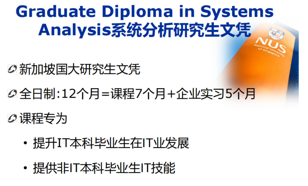 系统分析研究生文凭课程不限制学生学校背景及专业背景,为非IT学生提供入读IT课程机会。大三利用寒暑假时间线上即可完成部分模块课程,5个月新加坡线下相关岗位带薪实习。结课后GPA达到3.0即可获得系统科学院硕士课程直升机会,一次性帮助学生解决无相关课程背景,无工作经验、笔试面试不通过无法入读心仪课程的问题。