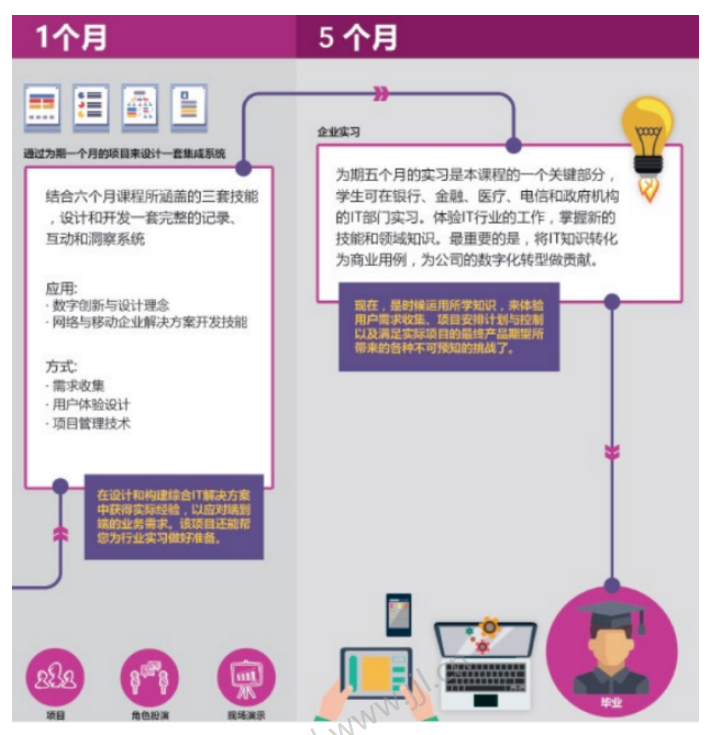 在5个月的新加坡带薪实习中,学生可以在多行业公司的IT部门进行实习,包括银行、金融、医疗保健、电信和政府部门等。将IT知识转化为业务能力,并在参与实习的公司为数字化转型做出贡献。