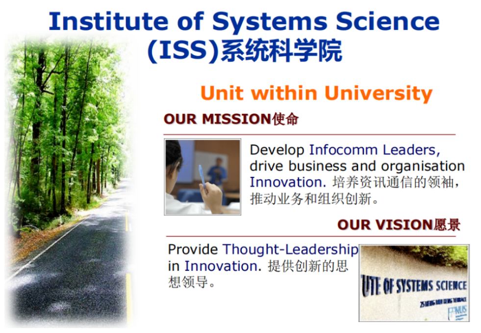 新加坡国立大学系统科学学院国大(2023年QS世界大学排名第11位,亚洲排名第1位)系统科学院创立于1981年,通过一系列研究生教育课程、专业发展课程、咨询、应用研究及就业辅导等项目,为有关行业领域培养数字人才。