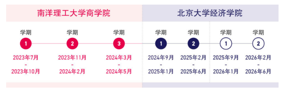 学生分阶段在两校完成各自培养方案认可的课程, 符合双方毕业要求的学生将获得南洋理工大学金融硕士学位和北京大学专业硕士学位。