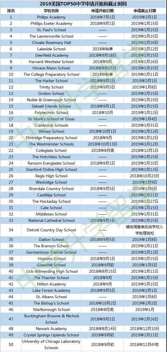 2019美国高中申请季已经开启!首先,我们来了解下TOP50中学的申请开放时间和截止时间吧!